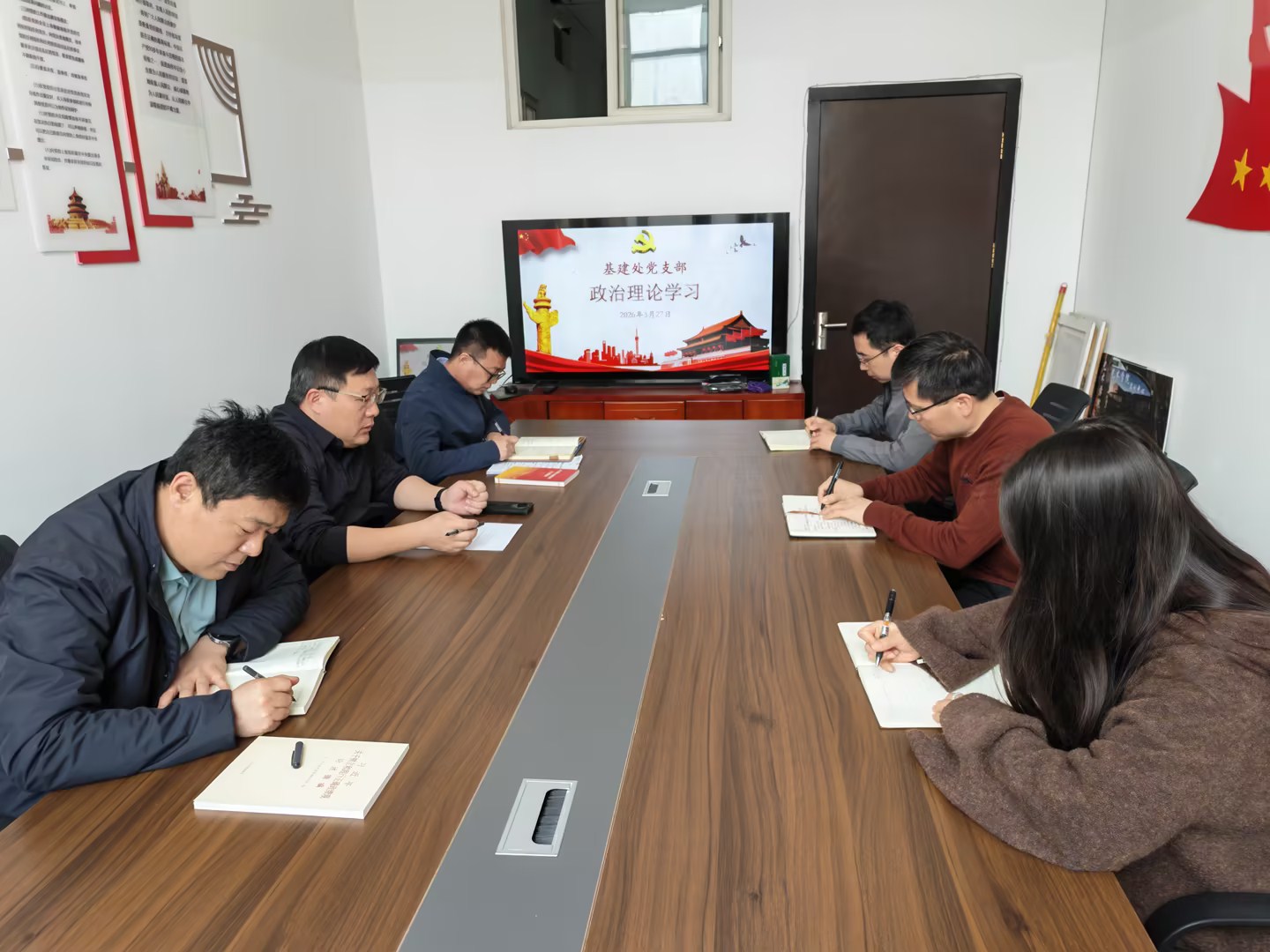 3月27日上午,基建处党支部召开全体党员大会,组织开展树立和践行正确政绩观学习教育,并由支部书记崔鹏为全体党员讲授“愿担当、敢担当、善担当”主题党课。